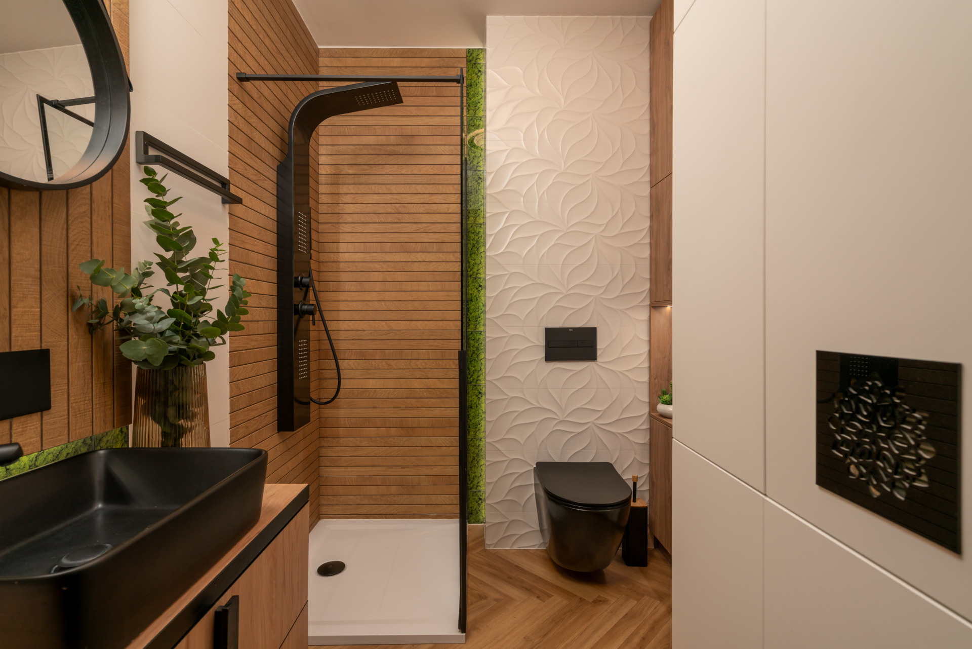 a także akwarium 400 litrów, oświetlenie tarasu, obrotowa szafka na buty, podświetlane szafy, chowana deska do prasowania.